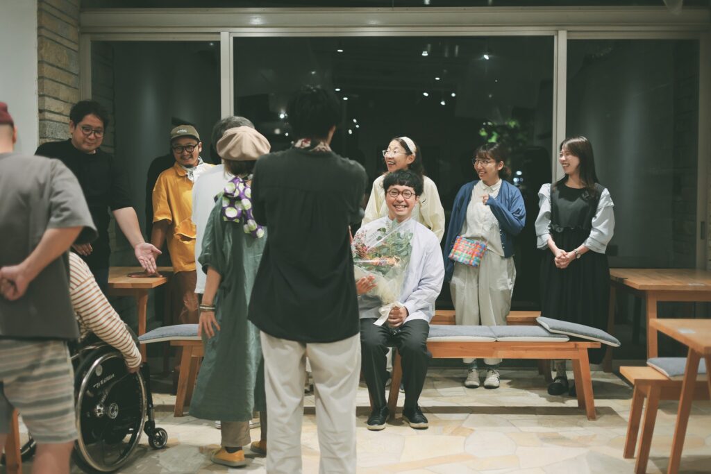 今尾さんは「暮らしの基金」制度を始めるなど、暮らし委員会のメンバーやまちに関わる人々がより楽しめるようなきっかけづくりをしてくれました。ありがとうとお疲れさまの気持ちを込めて、メンバー一同から大きな花束が贈られました。(こちらの花束はご近所のお花屋さん、karakuruさんが作ってくださいました!)