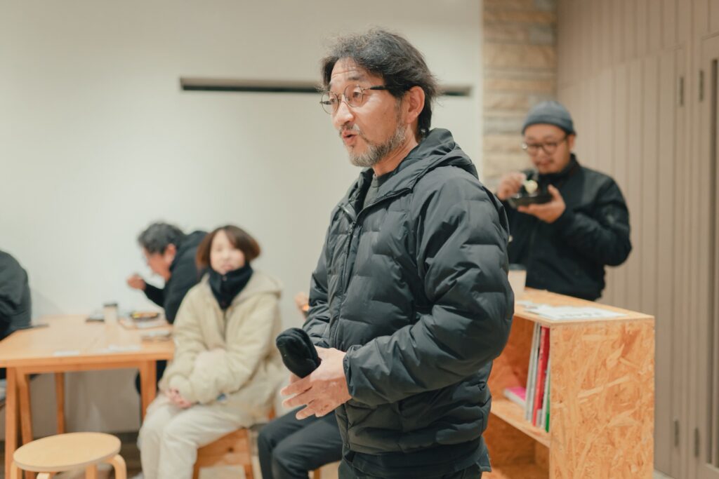 今夜の司会はフリーデザイナーのシンドーさん。暮らし委員のメンバーではないものの、1年ほど前から【寄り合い】の常連さん。お話がとても上手。Uターンで地元に戻ってきたシンドーさん。似たような経験をしている人と、ぜひ話をしてみたい。そんな思いを胸に【寄り合い】の場に足を運んだのがきっかけでした。