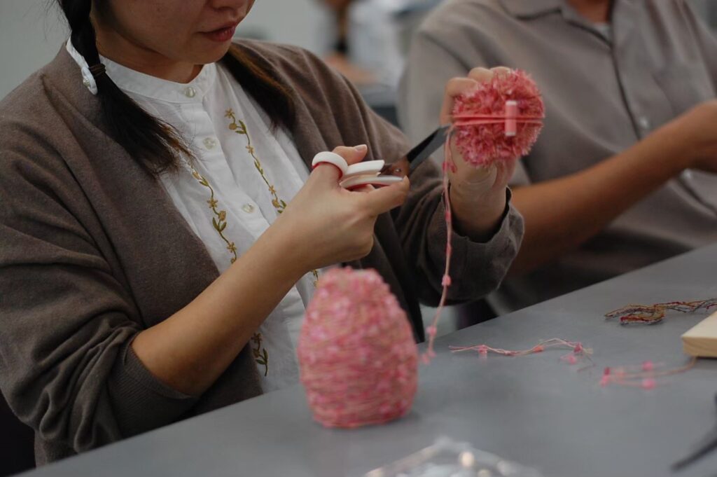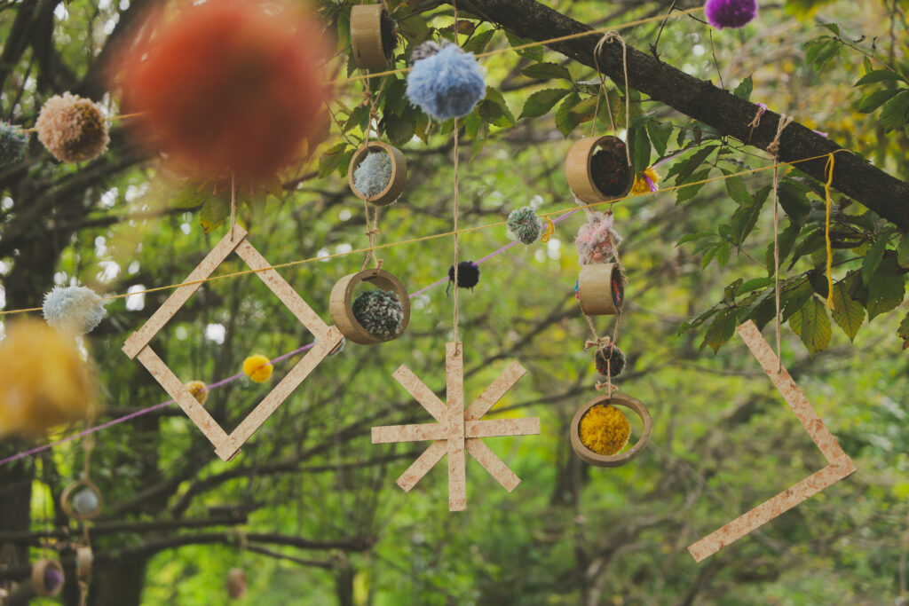 今年も、TRAVESSIAさんを中心に装飾をつくりました。装飾をつくる上で大切にしていることは「みんなの手でつくること」「できる限り資源を循環させること」。当日の装飾ができる上がる過程には、KURA 就労継続支援B型の皆さん、市民ボランティアさん達を中心にパーツを作成。また、素材には破棄されるはずの糸やリボン、塗料を譲り受け、今年のメインビジュアルのカラーに合わせて仕上げていきました。