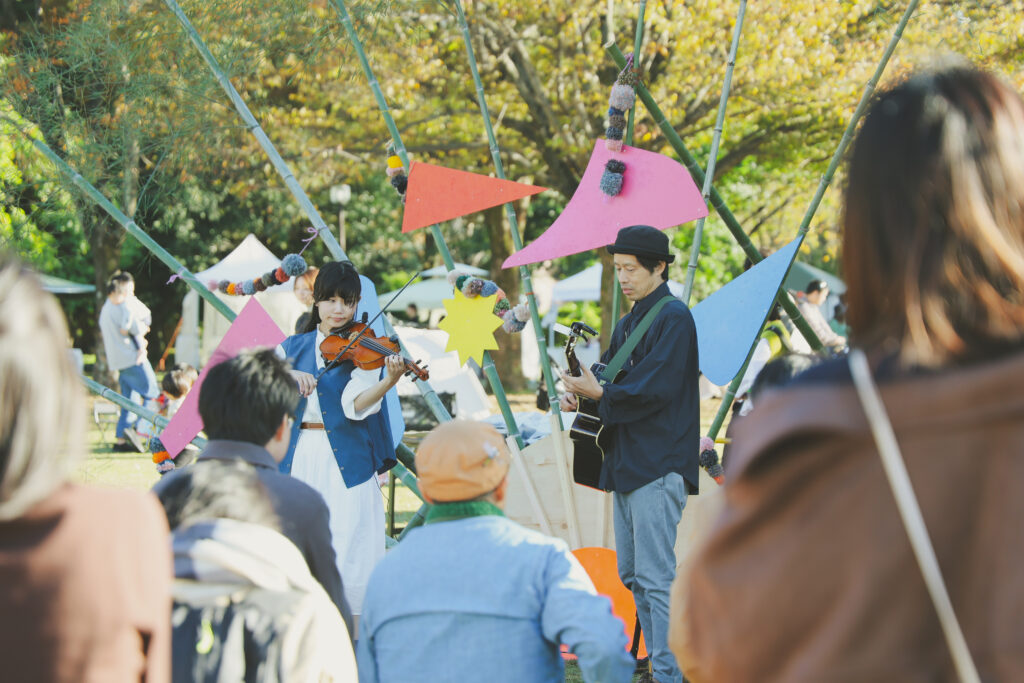 準備の時に雨が降り機材が濡れないためにKAKAMIGAHARA STANDの屋根の下で、O’rukkaさんの演奏からスタート。フィドルとギターで奏でる北欧の音楽で「マーケット日和が始まった!」というワクワク感を連れてきてくれます。